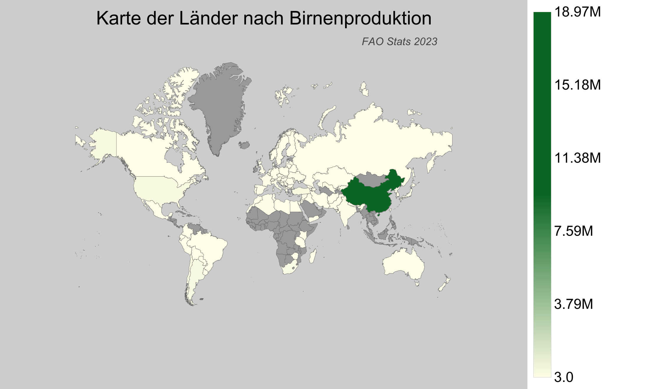 - China hält den ersten Platz mit einer Produktion von ca. 18,98 Millionen Tonnen Birnen im Jahr 2023.
