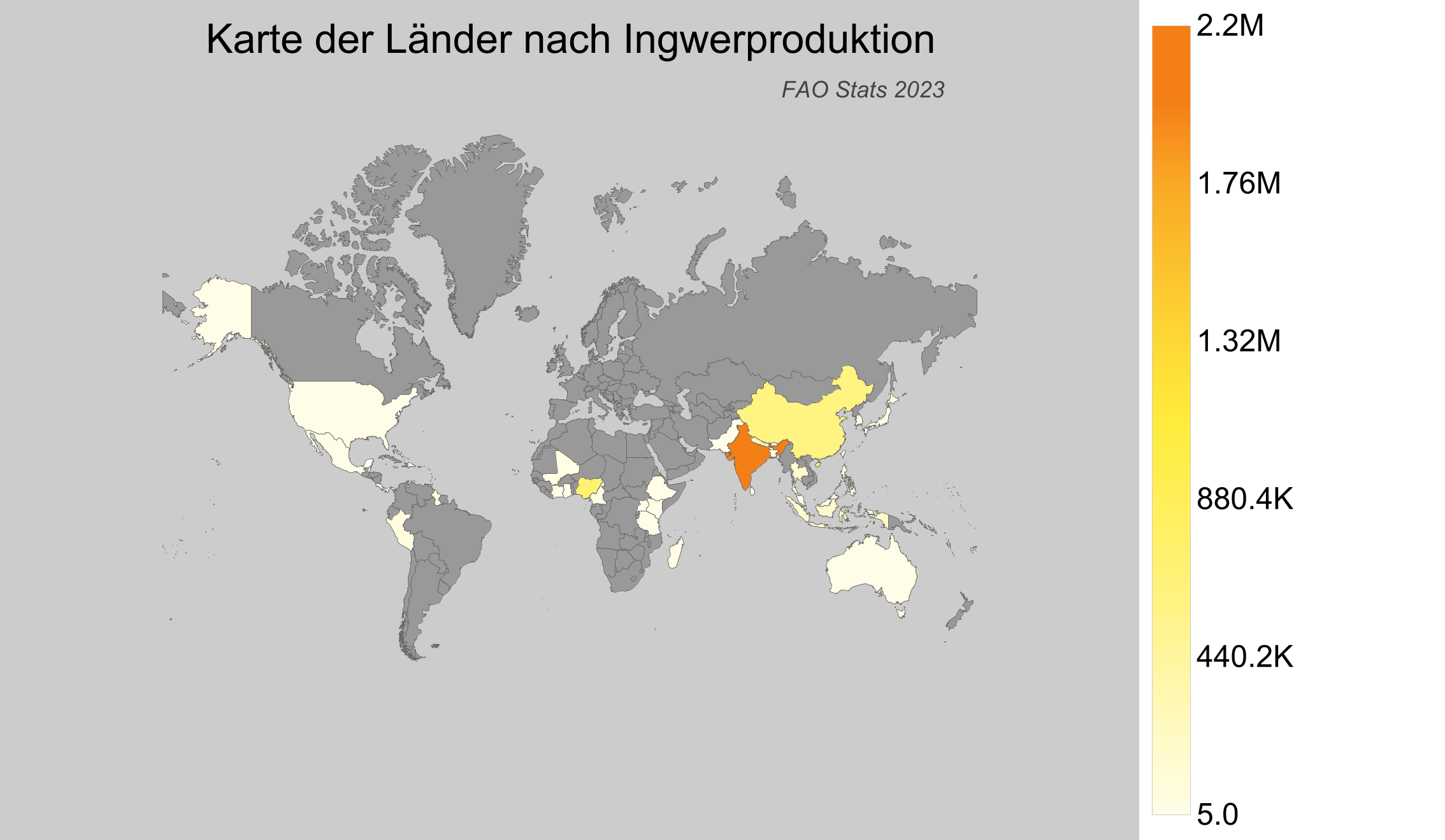 - Indien: Rund 2,2 Millionen Tonnen Ingwer wurden 2023 produziert, was das Land zum weltweit größten Produzenten macht.