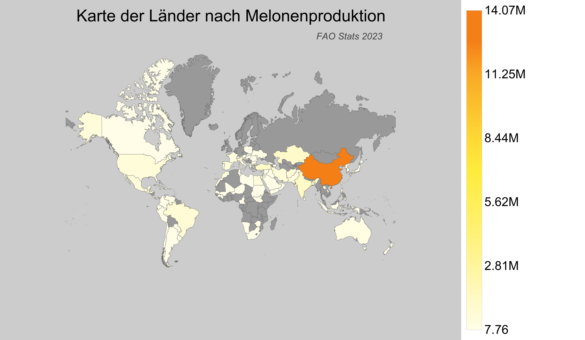 Melonen sind eine bedeutende Frucht in der globalen Landwirtschaft und Ernährung. Sie wachsen bevorzugt in warmen und gemäßigten Klimazonen und sind in vielen Regionen der Welt ein Grundnahrungsmittel. Unsere Daten für das Jahr 2023 stammen aus der neuesten verfügbaren Datenbank der Ernährungs- und Landwirtschaftsorganisation (FAO) und zeigen wichtige Trends und Statistiken über die weltweite Melonenproduktion.