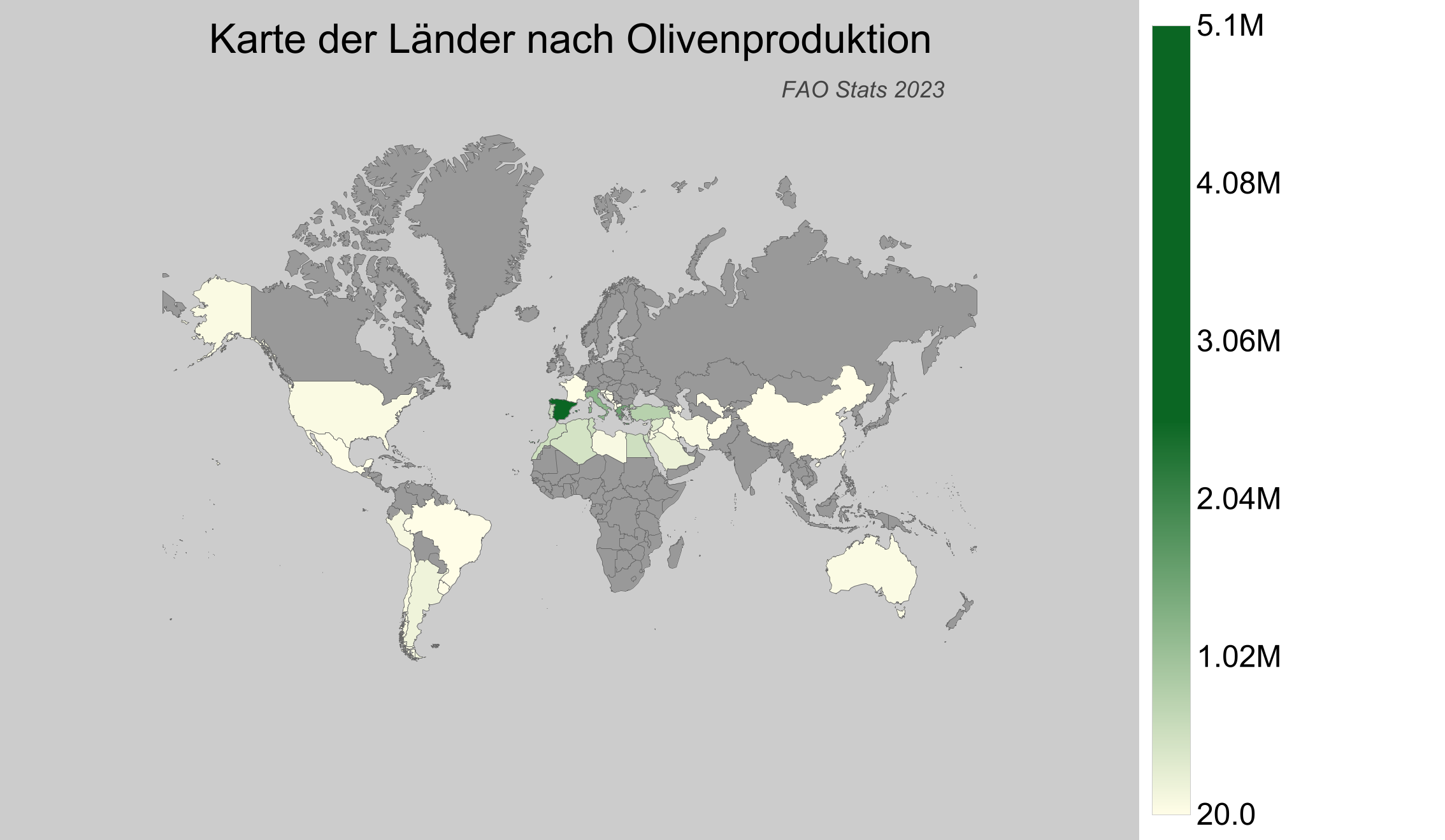 - Spanien dominiert die globale Olivenproduktion mit einem Anteil von 25,1%, was ein Viertel der gesamten Welternte ausmacht.