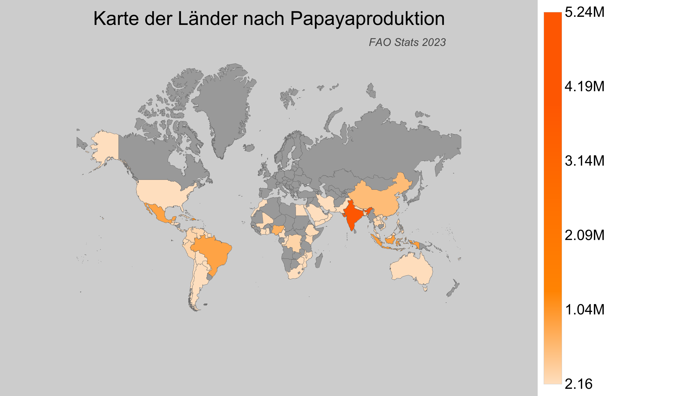 Papaya ist eine bedeutende tropische Frucht, die in warmen, feuchten Klimazonen gedeiht. Die Frucht ist bekannt für ihre gesundheitlichen Vorteile, einschließlich reichhaltiger Vitamine und Antioxidantien. Der Anbau erfordert konstante Wärme und wird überwiegend in tropischen und subtropischen Regionen angebaut. Diese Daten stammen aus den neuesten verfügbaren Statistiken für das Jahr 2023 gemäß der Datenbank der Ernährungs- und Landwirtschaftsorganisation (FAO), Stand 2025.