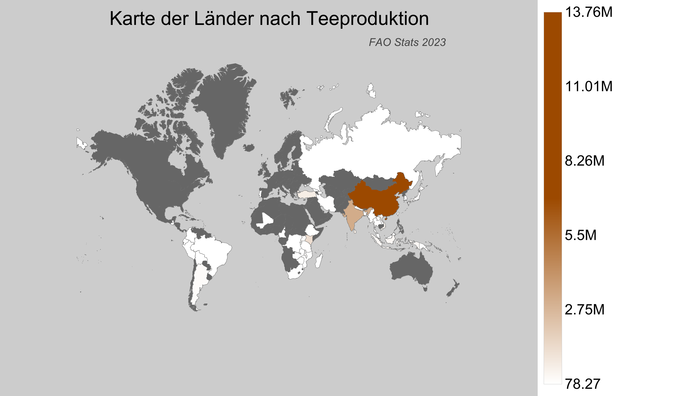 Tee ist eines der beliebtesten Getränke weltweit, geschätzt für seine beruhigenden und gesundheitsfördernden Eigenschaften. Tee gedeiht in gemäßigten bis tropischen Klimazonen, oft in hügeligen Regionen mit reichhaltigem Boden. Die Daten, die wir hier vorlegen, stammen aus dem Jahr 2023 und sind die aktuellsten verfügbaren Daten aus der Datenbank der Ernährungs- und Landwirtschaftsorganisation (FAO) ab 2025.