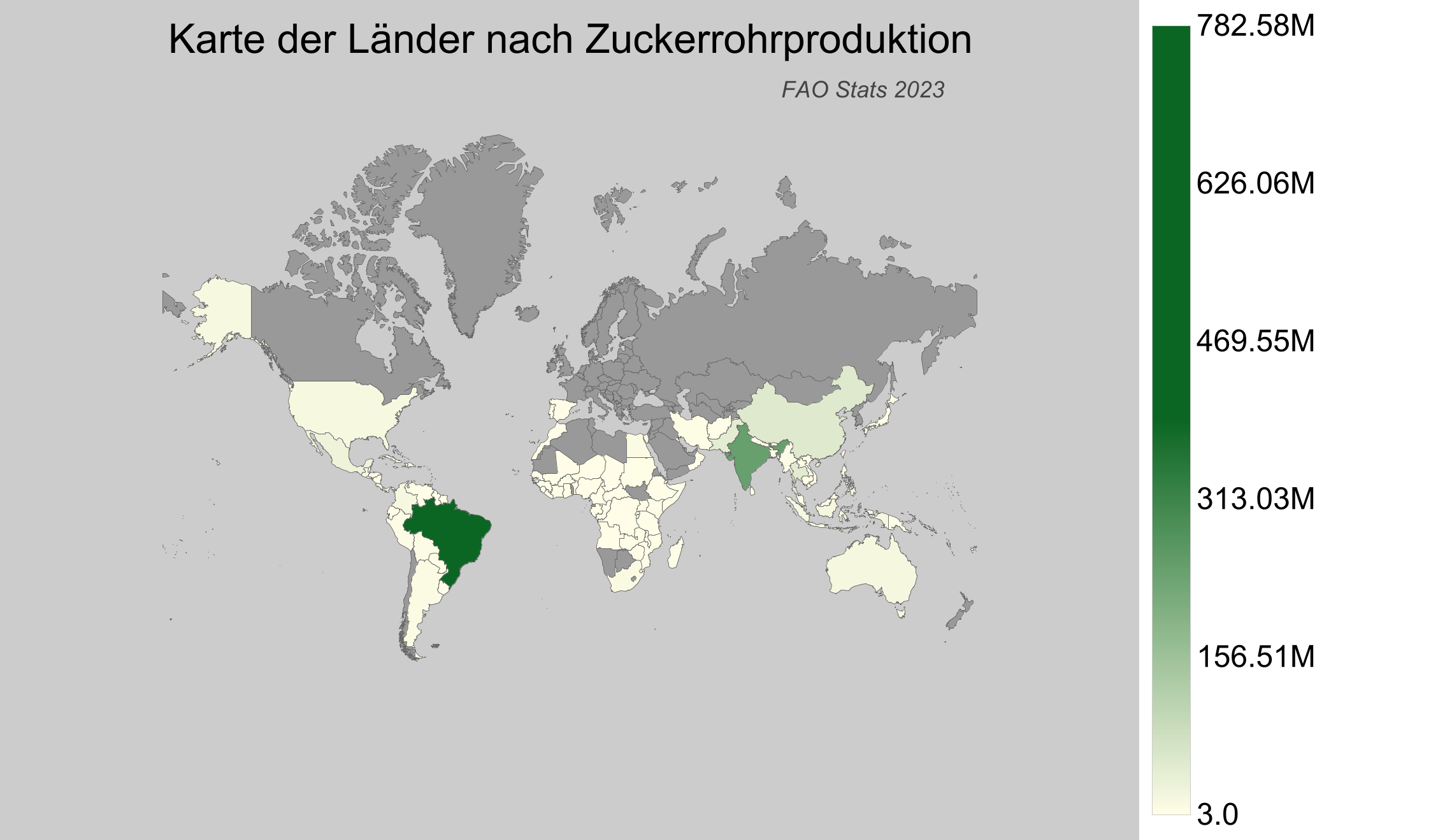 - Brasilien dominiert mit einer Produktion von rund 783 Millionen Tonnen, was fast 39% der Weltproduktion ausmacht.